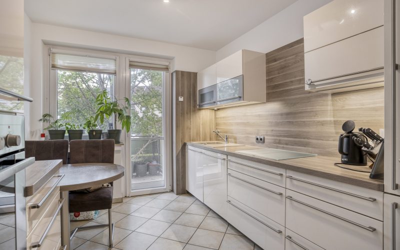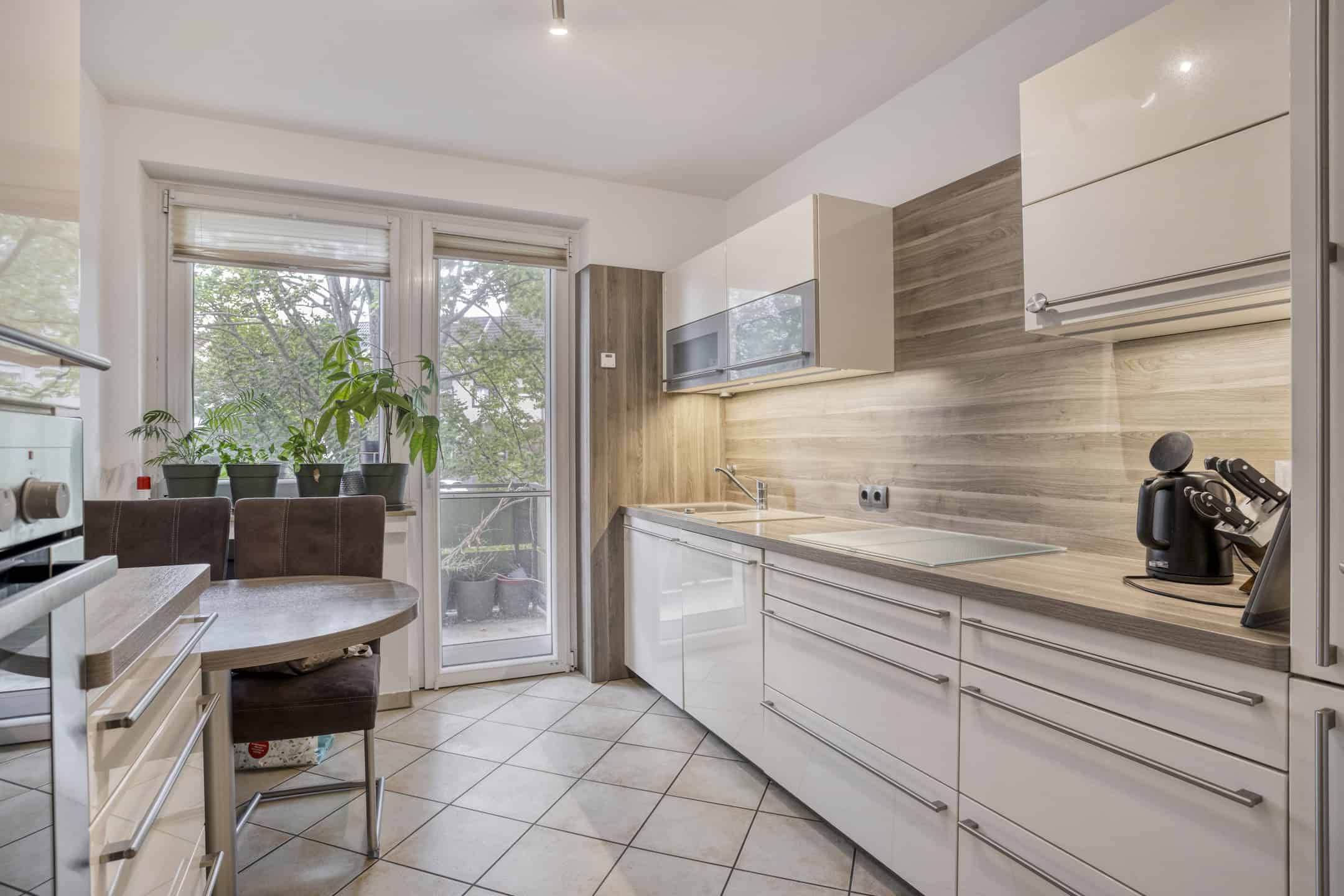 Im Eingangsbereich befindet sich rechts die moderne, im Kaufpreis enthaltene, Einbauküche. Hier haben Sie genügend Platz, um einen kleinen Tisch aufzustellen – ideal für ein schnelles Frühstück oder gesellige Kochabende. Von der Küche gelangen Sie zudem direkt auf den Balkon, der einen herrlichen Blick ins Grüne bietet und zum Entspannen einlädt.