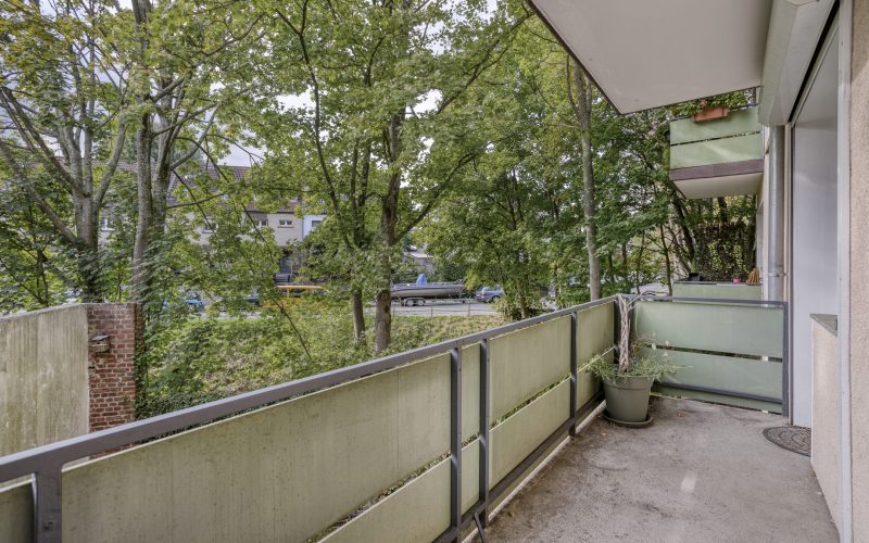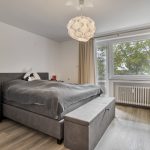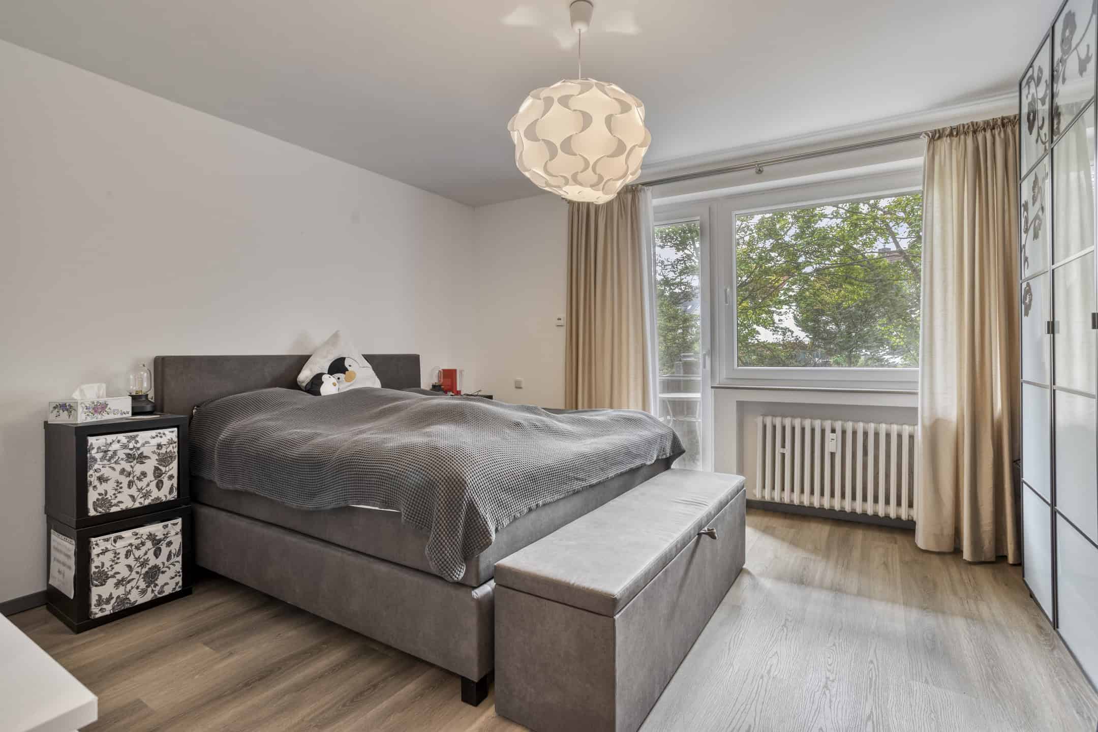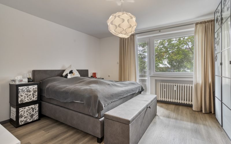 Weiter hinten rechts im Flur liegt das ruhige Schlafzimmer, das ebenfalls über einen Zugang zum Balkon verfügt. Es bietet ausreichend Stellfläche für ein gemütliches Bett sowie einen großen Kleiderschrank.