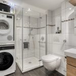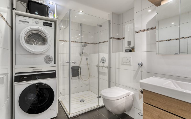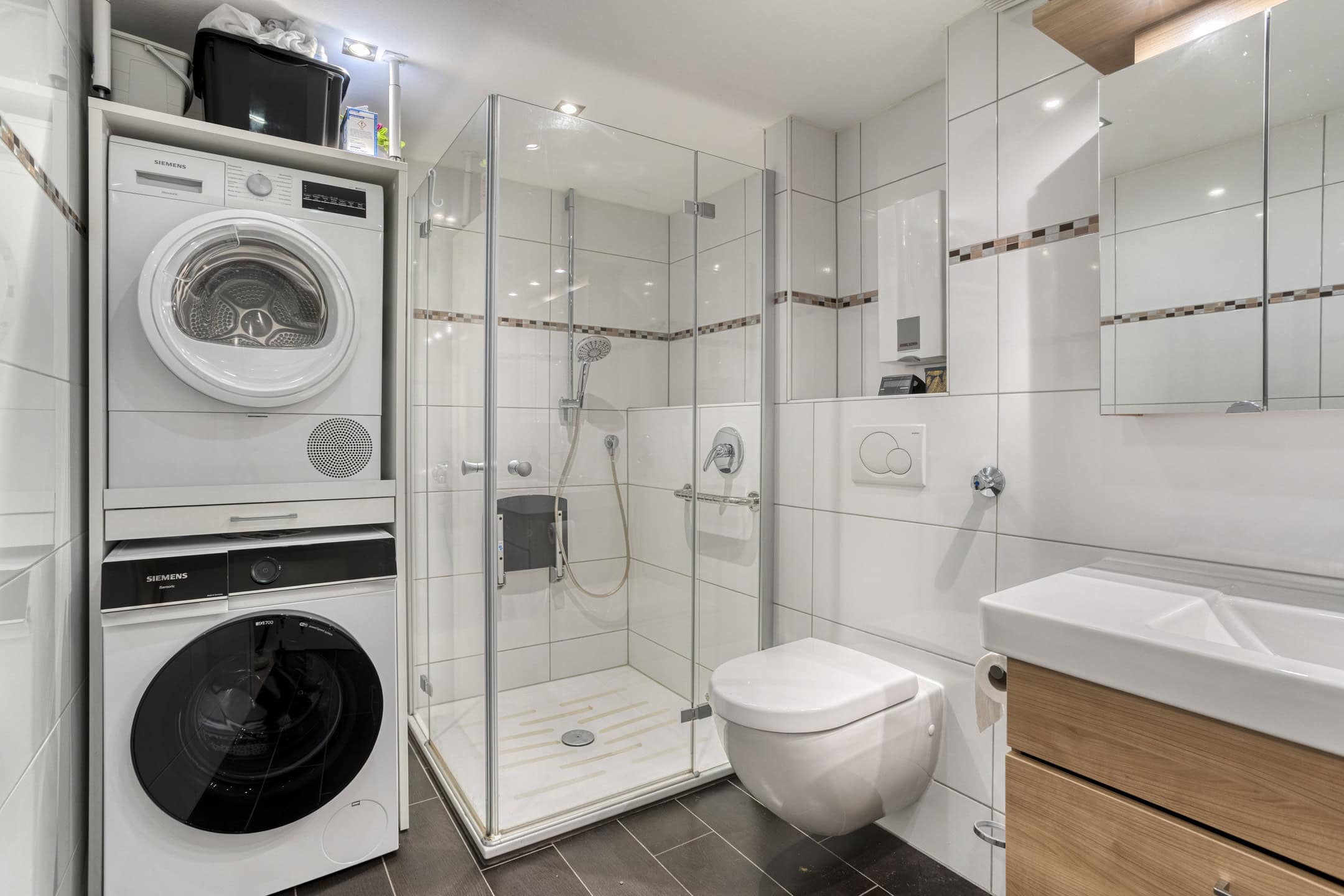 Im hinteren Bereich der Wohnung befindet sich das moderne Badezimmer. Es ist mit einer großen Dusche, einem Waschtisch mit Unterschrank sowie einem Stellplatz für Ihre Waschmaschine und Ihren Trockner ausgestattet – alles, was Sie für Ihren täglichen Komfort benötigen.