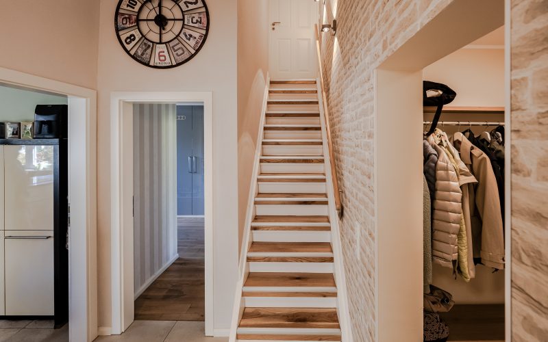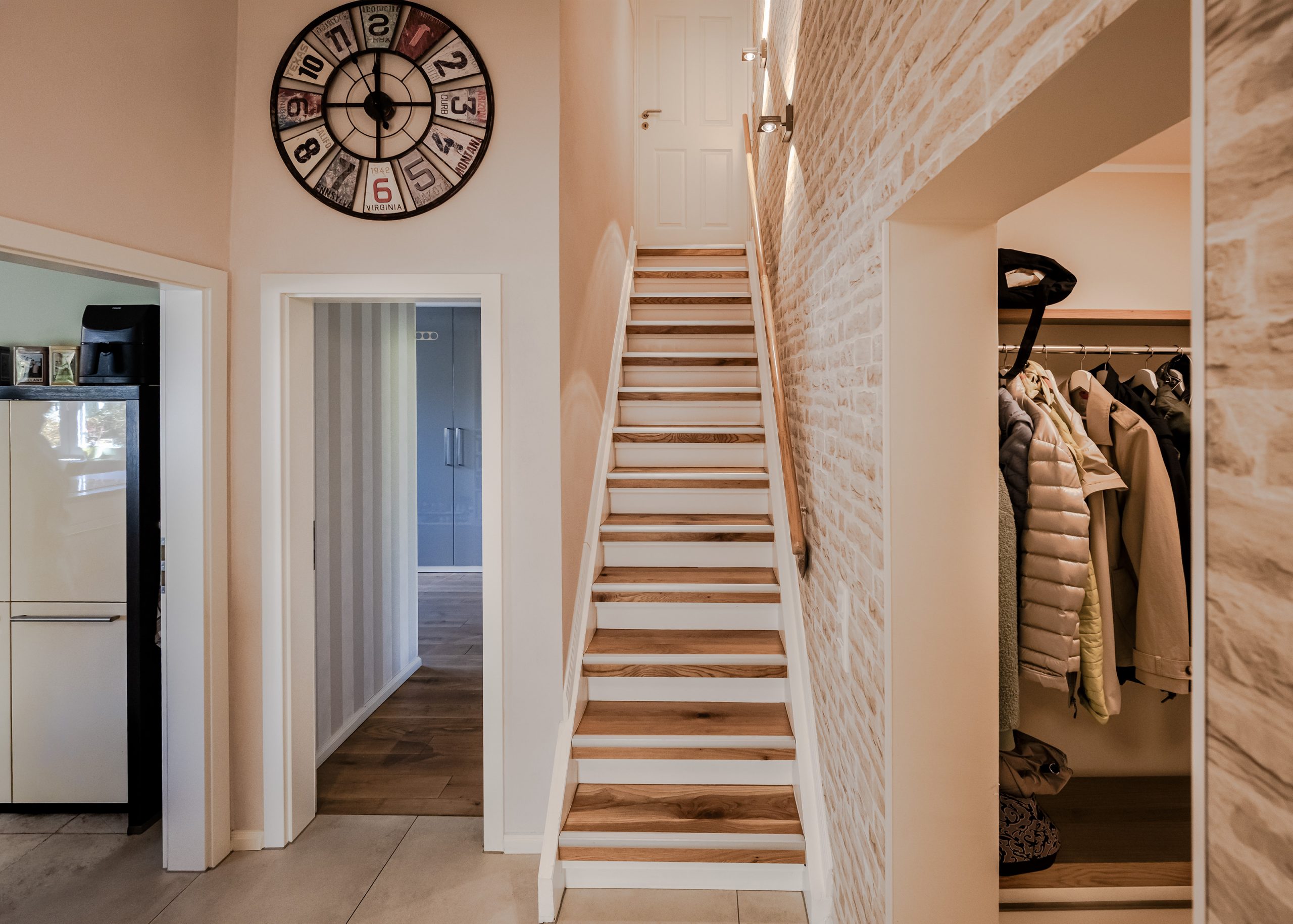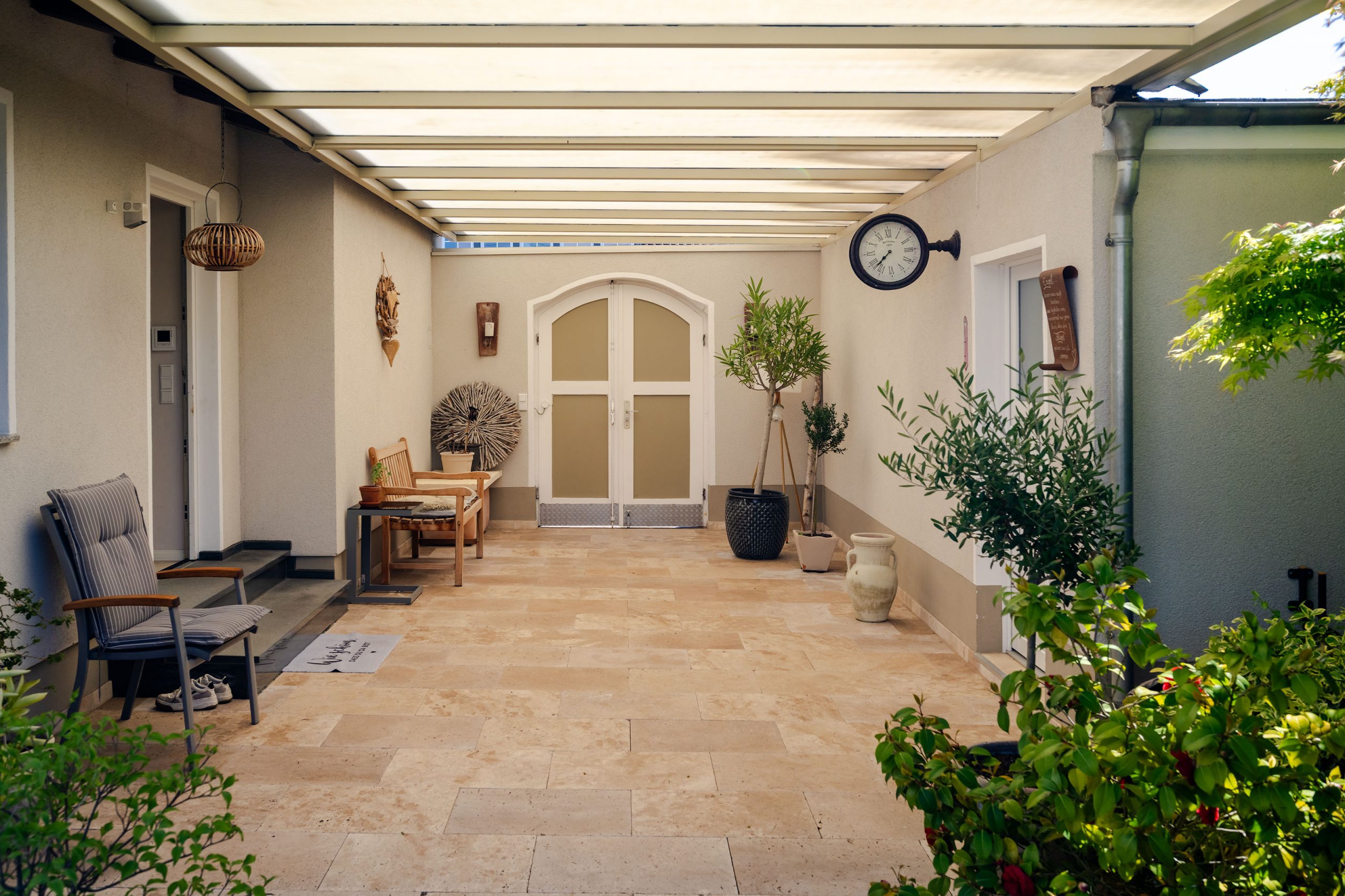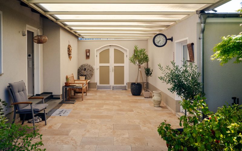 Besonders hervorzuheben ist der geschützte, überdachte Eingangsbereich, der nicht nur optisch überzeugt, sondern auch bei jeder Witterung einen komfortablen Zugang zum Haus bietet. Er kann zudem als überdachte Spielfläche für Kinder oder als geschützte Sitzfläche für Grillabende genutzt werden.