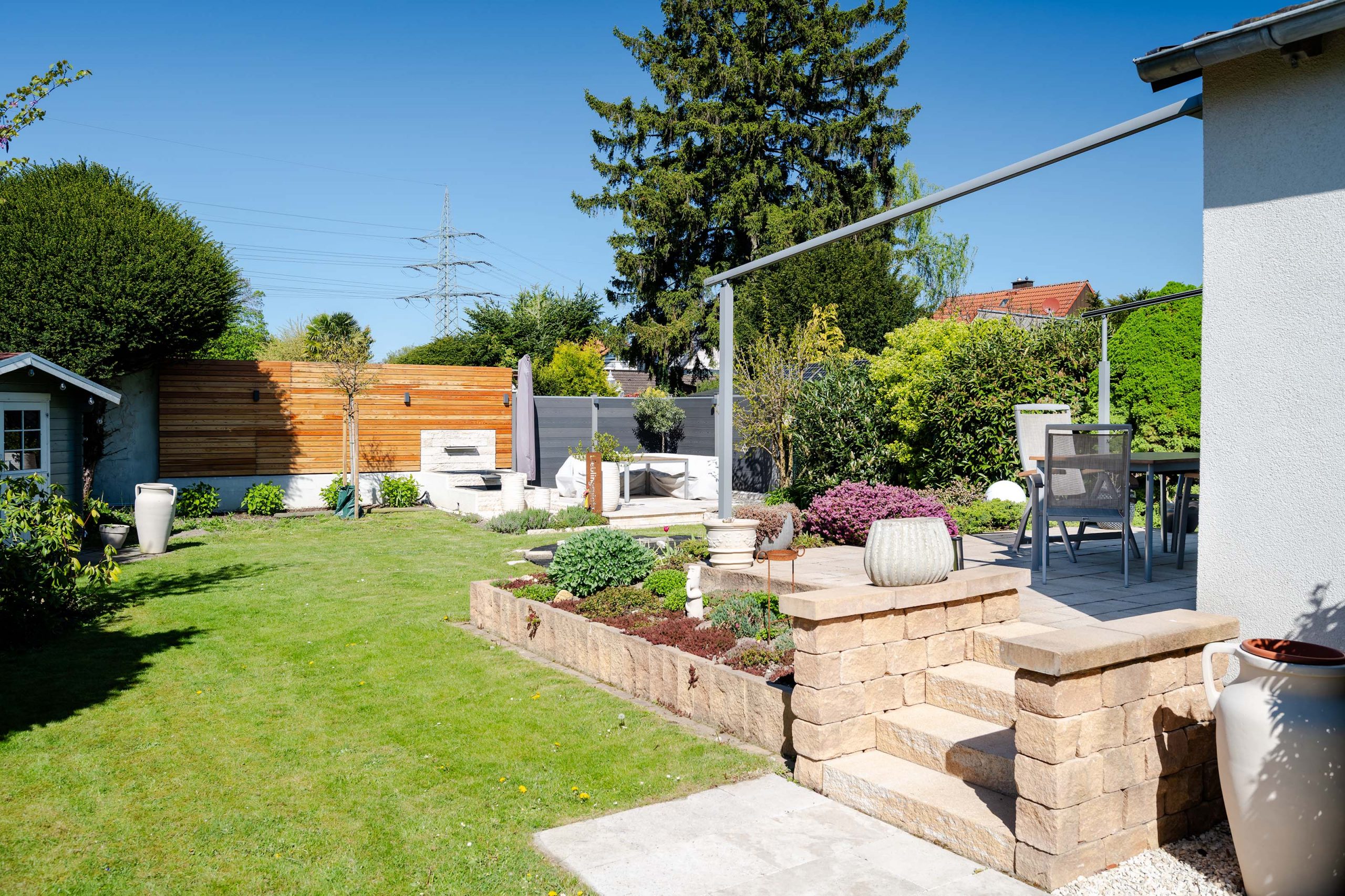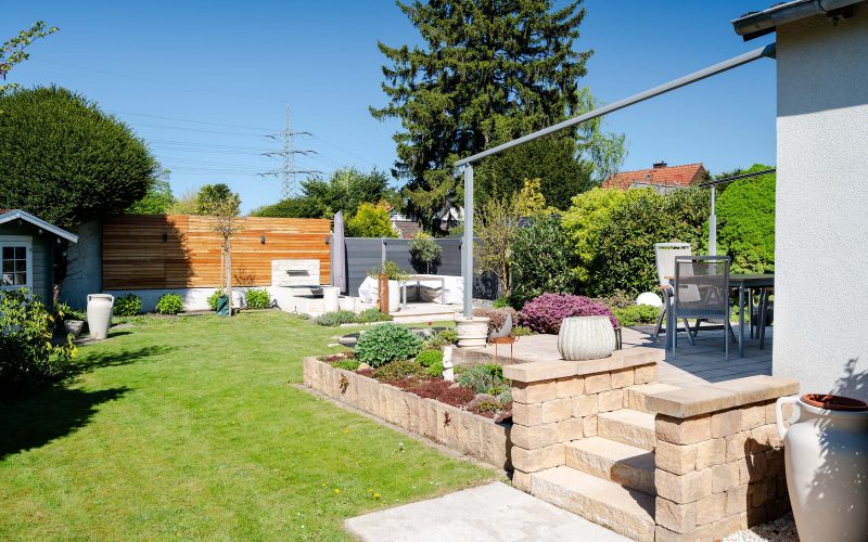 Der gepflegte und mühevoll angelegte Garten mit zwei Terrassen lädt zum Verweilen ein.