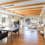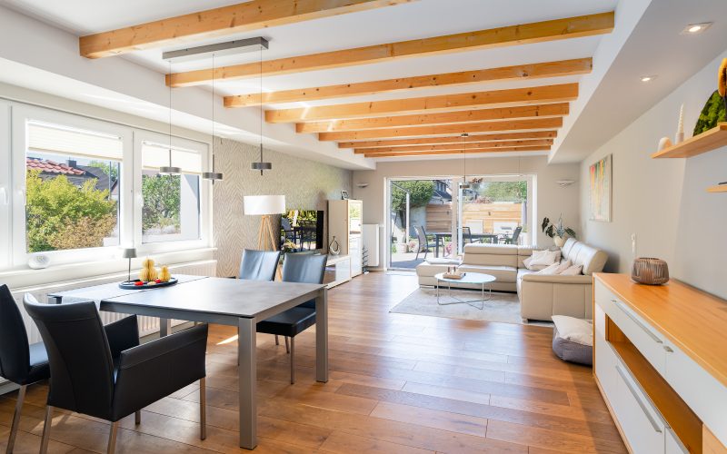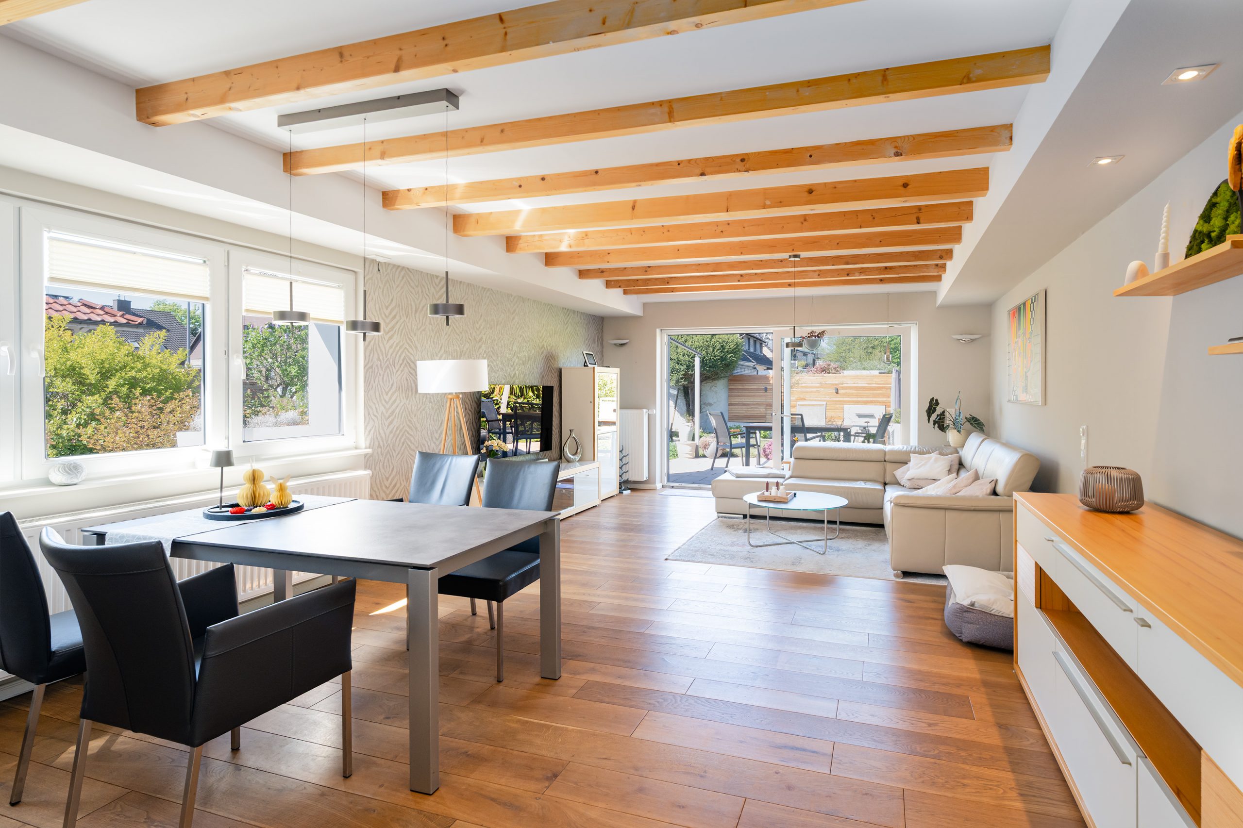 Im Inneren erwartet Sie ein offenes, lichtdurchflutetes Wohnkonzept mit großzügigem Wohn- und Essbereich samt integrierter Küche. Sichtbare Balken, Parkettboden und bodentiefe Fenster schaffen eine warme, einladende Atmosphäre mit tollem Blick in den Garten.