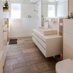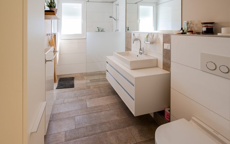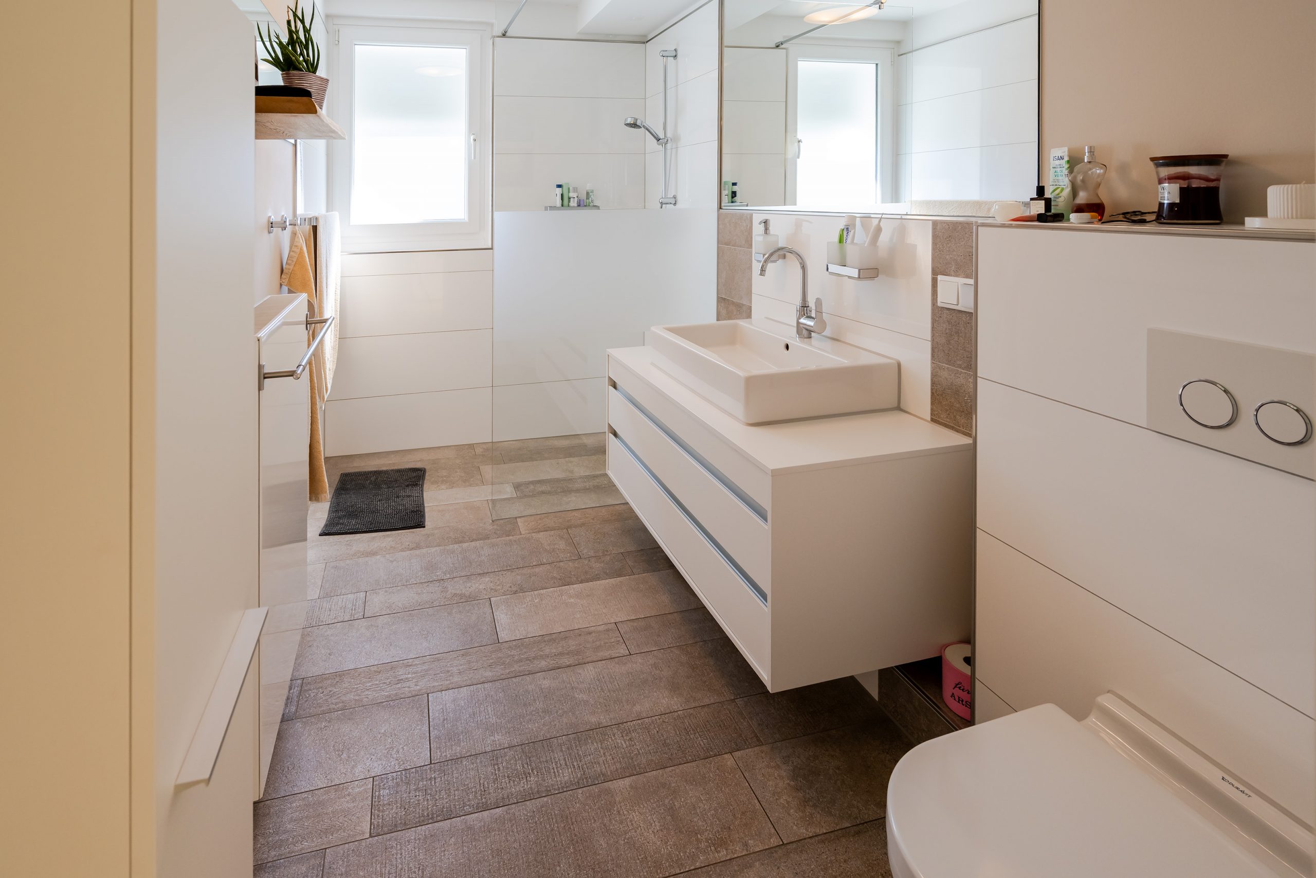 Ein modern gestaltetes Bad mit ebenerdiger Dusche, ein Hauswirtschaftsraum sowie ein großzügiger Keller runden das Raumangebot ab.